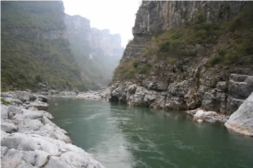“小三峡”位于蜈蚣岩段,长3.5公里,两岸悬崖绝壁高数百丈,平整光滑,形如刀削,相距不过一、二百米。河中巨石横亘,滩陡浪高,十里长滩弯环曲折,节节相连,环环相扣,如巨形蜈蚣蜿蜒而下,游人到此,有如置身于长江三峡之感。