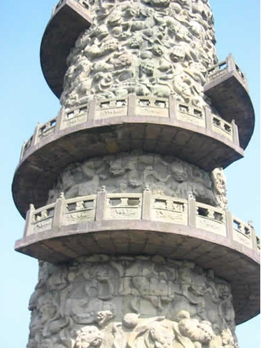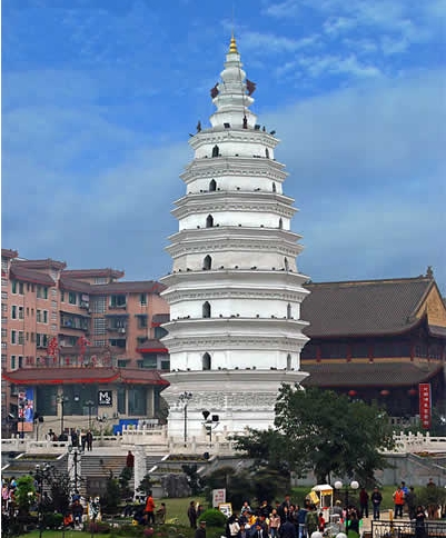 报恩塔,俗称“白塔”,四川省文物保护单位,位于泸州城区。建于南宋绍兴十八年(1148),明弘治年间、清光绪四年、1985年三次维修。塔坐西向东,砖石结构,双檐七级楼阁式,通高33.2米。塔身呈八边形,层层上收,107级踏道经塔心盘旋至顶,塔内90龛256尊深浮雕石刻造像,人物线条流畅,栩栩如生。塔基为八边形,边长4.1米。底层4.5米,檐下砖砌仿木斗拱,第二、三层檐下有负重鸟兽类雕塑,保存完整。塔为泸南安抚使冯楫为报母恩而建。