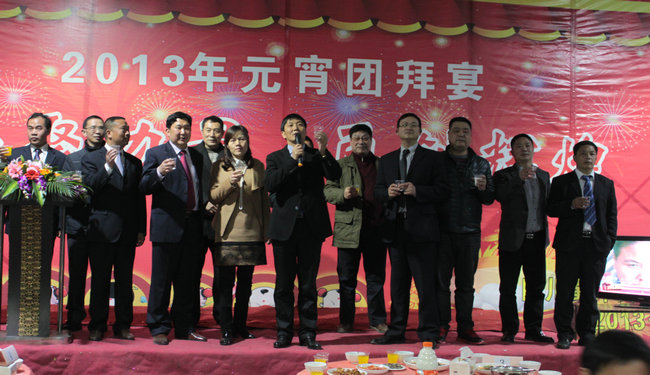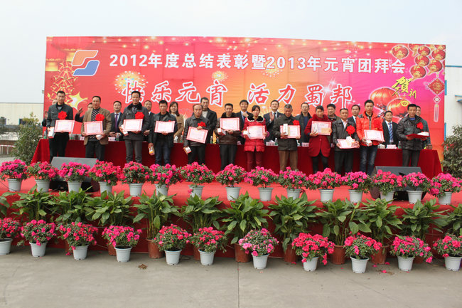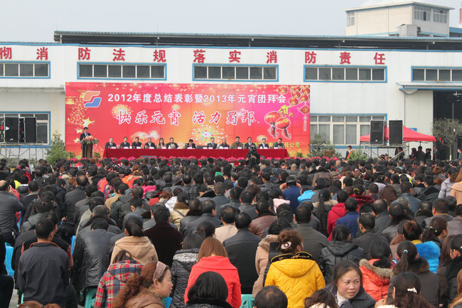 2月24日下午3时,会长单位四川蜀邦实业有限公司主题为“快乐元宵,活力蜀邦”的“2012度总结表彰暨2013年元宵团拜会”在该公司篮球场及洗水二车间隆重举行。参加此次盛大元宵团拜活动的有蜀邦公司领导、嘉宾、全体员工。此次活动按议程分为“总结表彰会”、“文艺演出与抽奖”、“晚宴”等三个部分。