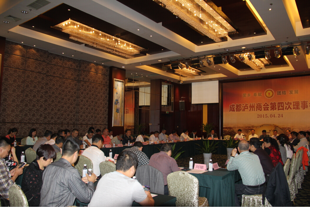 成都泸州商会第四次理事会于2015年4月24日下午在成都怡东国际酒店成功举行。出席会议的有成都市工商联会员处副处长曹渝、老领导兼商会顾问曾维荣、商会理事会全体成员、拟新增补副会长、常务理事以及商会秘书处驻会人员等70余人。会议由常务副会长兼秘书长倪正雄主持。