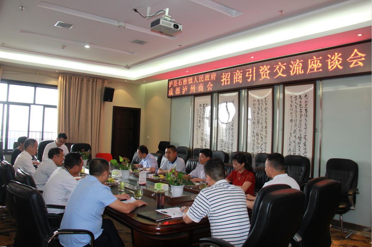 6月8日上午,泸县石桥镇政府、成都泸州商会招商引资交流座谈会在我会会议室召开。中共泸县石桥镇党委书记杜良仲、泸县石桥镇副镇长田恩富、泸县石桥镇招商办主任周荣华、中共泸县石桥镇十三坡社区党支部书记陈德智出席;我会党委书记、会长李子茂、常务副会长胡小平、成都泸州商会家居行业分会会长石美全及家居分会部分人员参加。座谈会由商会副秘书长王泽野主持。