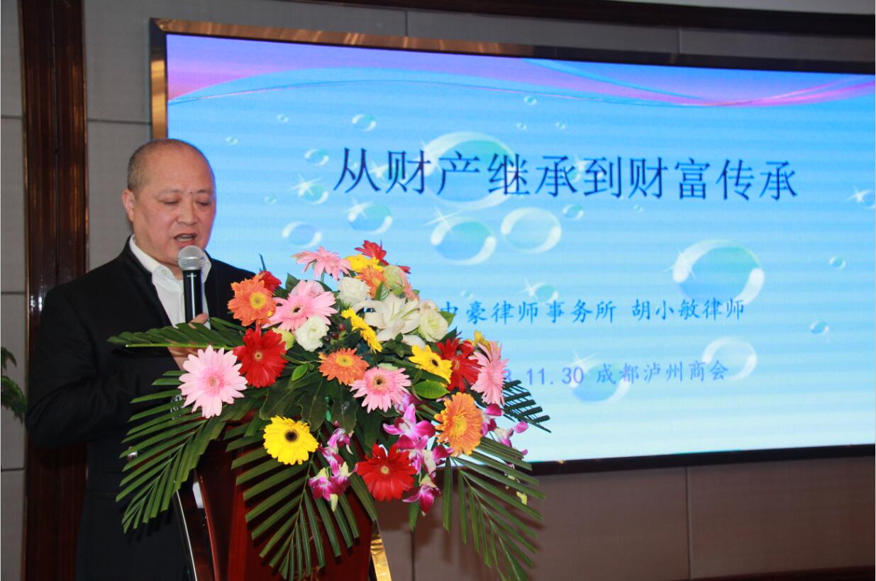 讲座第一阶段是由资深婚姻家事、财富管理传承律师,四川省优秀青年律师,成都市中级人民法院特邀调解员,成都泸州商会常年法律顾问单位四川中豪律师事务所合伙人胡小敏律师主讲的“财富传承”讲座。胡律师从个人财产的继承管理、家族财产的继承管理、遗嘱订立的科学性有效性等几个方面为大家讲解了财富传承的风险、问题和主要方式以及财富管理与传承工具的运用。
