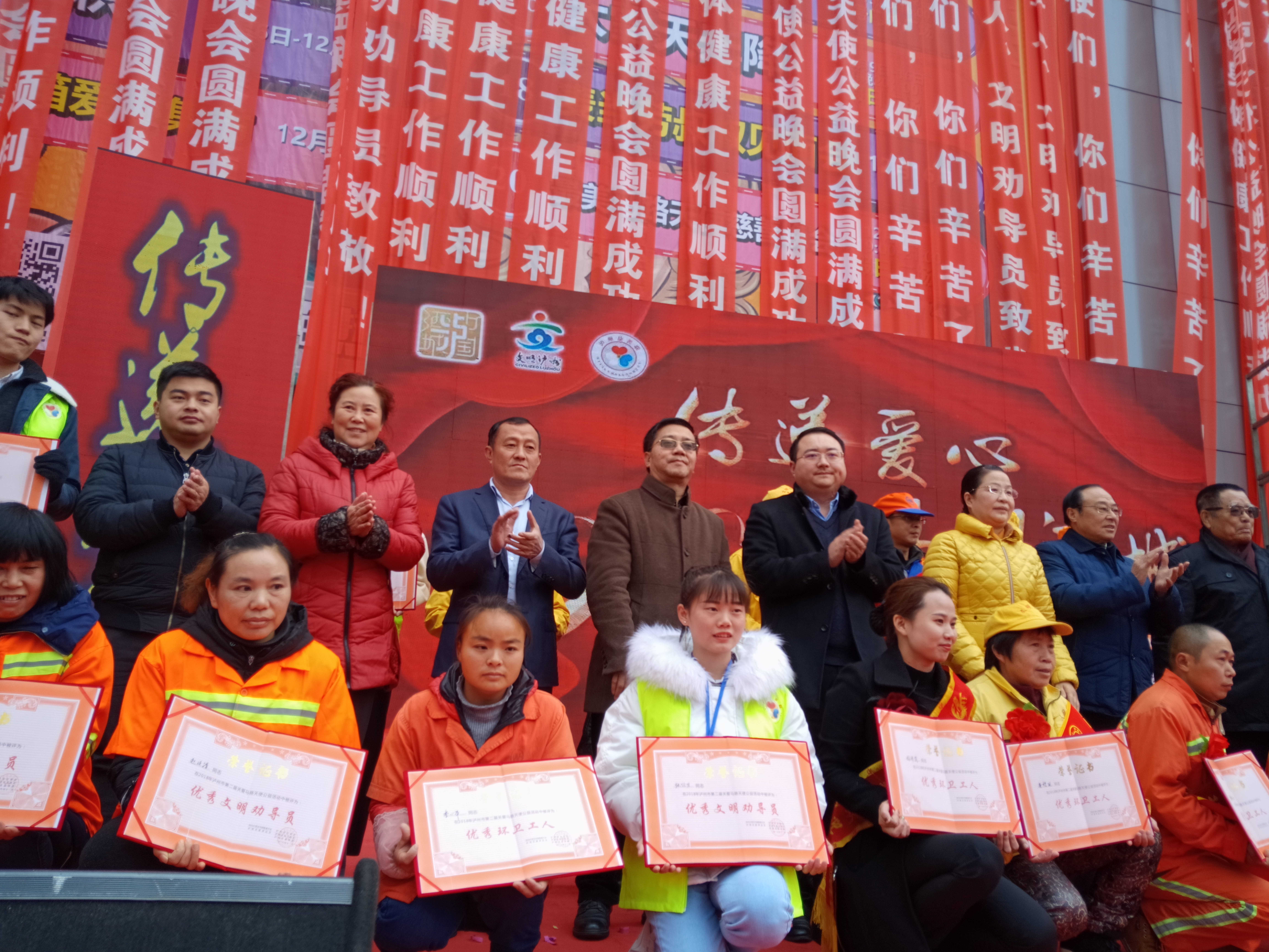 12月9日下午,由泸州市益善联公益发展中心主办、主题为“爱满酒城·共享文明”的泸州市第二届关爱马路天使公益晚会在泸州市步步高广场举行,我会党委书记、会长李子茂,副秘书长石乔、王泽野出席活动。会长李子茂作为企业代表,为优秀环卫工人颁奖,并现场参与了环卫工结对帮扶活动。