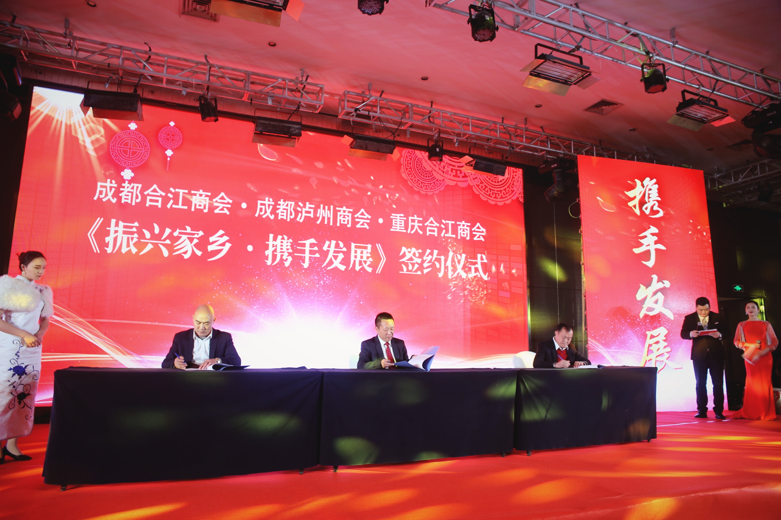 1月13日,成都合江商会纪念改革开放四十周年暨2019新春联谊会在成都武候区举行,年会邀请到了政府各级嘉宾、成都市武候区工商联、合江县政府、合江县工商联等领导参加,我会会长李子茂率队10余人参加,并作为友好商会代表致辞。 年会上,举行了隆重的《振兴家乡·携手发展》签约仪式,成都泸州商会、成都合江商会、重庆合江商会三家商会共同签署了《振兴家乡·携手发展》条约;同时,年会还举行了电子商务平台公司启动仪式,商会代表和特邀嘉宾、领导共同上台见证了商务平台公司的启动。年会还为新增的监事长、副会长、理事进行了授牌仪式;对2018年度表现优秀的单位和个人进行了表彰。 我会会长李子茂代表友好商会致辞,他对过去一年,合江商会取得的成绩表示祝贺;对成都泸州商会、成都合江商会、重庆合江商会签署的《振兴家乡·携手发展》协议和合商电子商务平台的启动大加赞赏。并表示,希望大家以振兴家乡为共同目标,以电商平台为依托,共同为在外泸州人争光添彩,为泸州家乡经济的发展贡献力量。