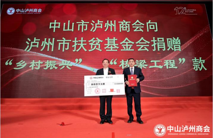 会议还举行了中山市泸州商会助力乡村振兴捐赠仪式,分别向中山市沙溪镇政府、泸州市扶贫基金会捐赠了乡村振兴学校改造款和“乡村振兴”、“栋梁工程”款。