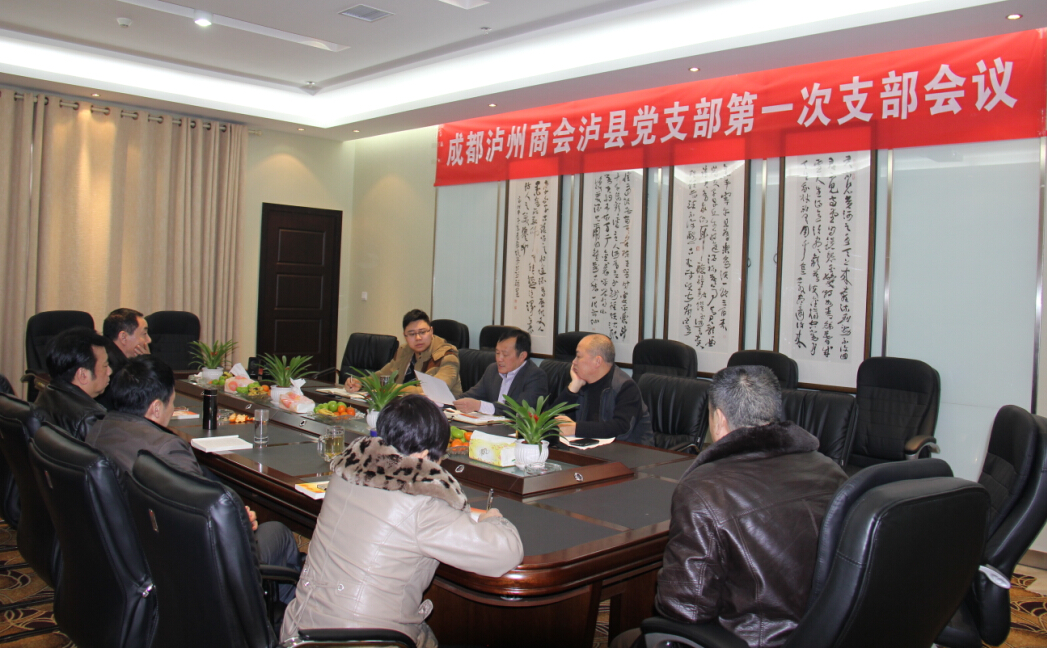 2015年1月20日下午3点,成都泸州商会泸县党支部第一次支部会议在成都泸州商会会议室召开,支部书记李子茂介绍了党支部概况;书面传达学习了《党的十八届四中全会<决定>学习辅导百问》一书;会议还讨论成立了党小组长、确定了党支部兼职财务人员、党支部活动经费来源等情况。
