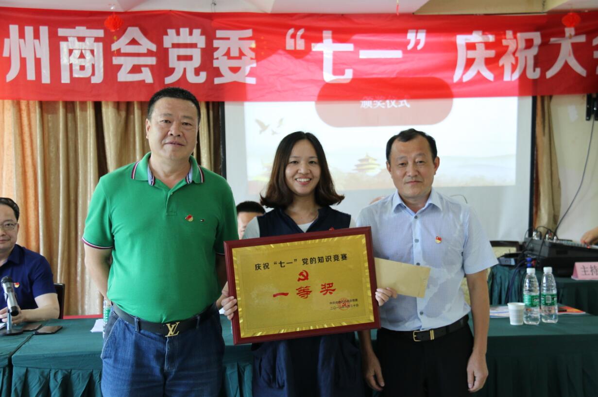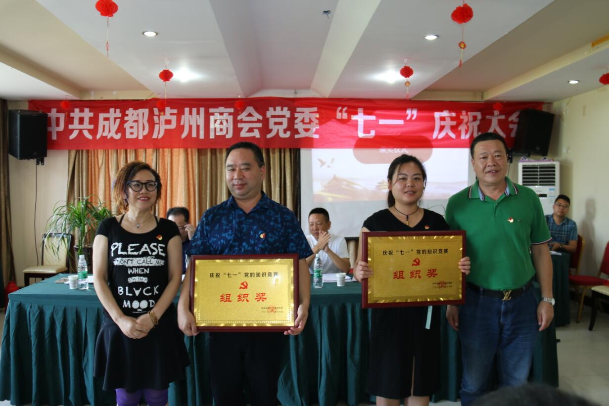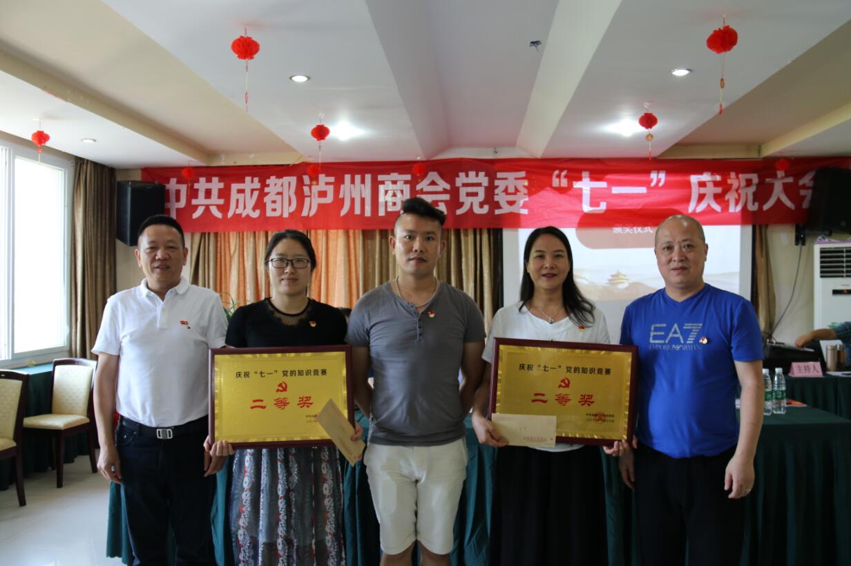 在全体党员同志雄壮的《中华人民共和国国歌》声中,庆祝大会拉开了序幕。大会首先进行了党的知识竞赛环节,有8个党支部参加了本次知识竞赛,竞赛由商会党委办李春艳主持。知识竞赛共分为必答题和抢答题两个部分,由于各参赛队伍的充分准备,第一轮必答题环节除两个党支部各答错一道题外,其他6个党支部均满分通过;后面的抢答题环节中,各队踊跃抢答,但强中有强、快中有快,答题权总是在胸有成竹中遗憾的被其他党支部抢占先机。值得一提的是凡是抢到答题权的支部,没有一题答错,而且泸县党支部一马当先,靠抢答题环节迅速拉开了与其他党支部的分差,玉琢党支部、科友党支部奋起直追,引来现场一浪高过一浪的掌声和欢呼声。通过现场激烈角逐,泸县党支部喜获一等奖;玉琢党支部、科友党支部荣获二等奖;红牛党支部、舒创党支部、蜀邦党支部分获三等奖;金福娃党支部、古蔺党支部获组织奖。