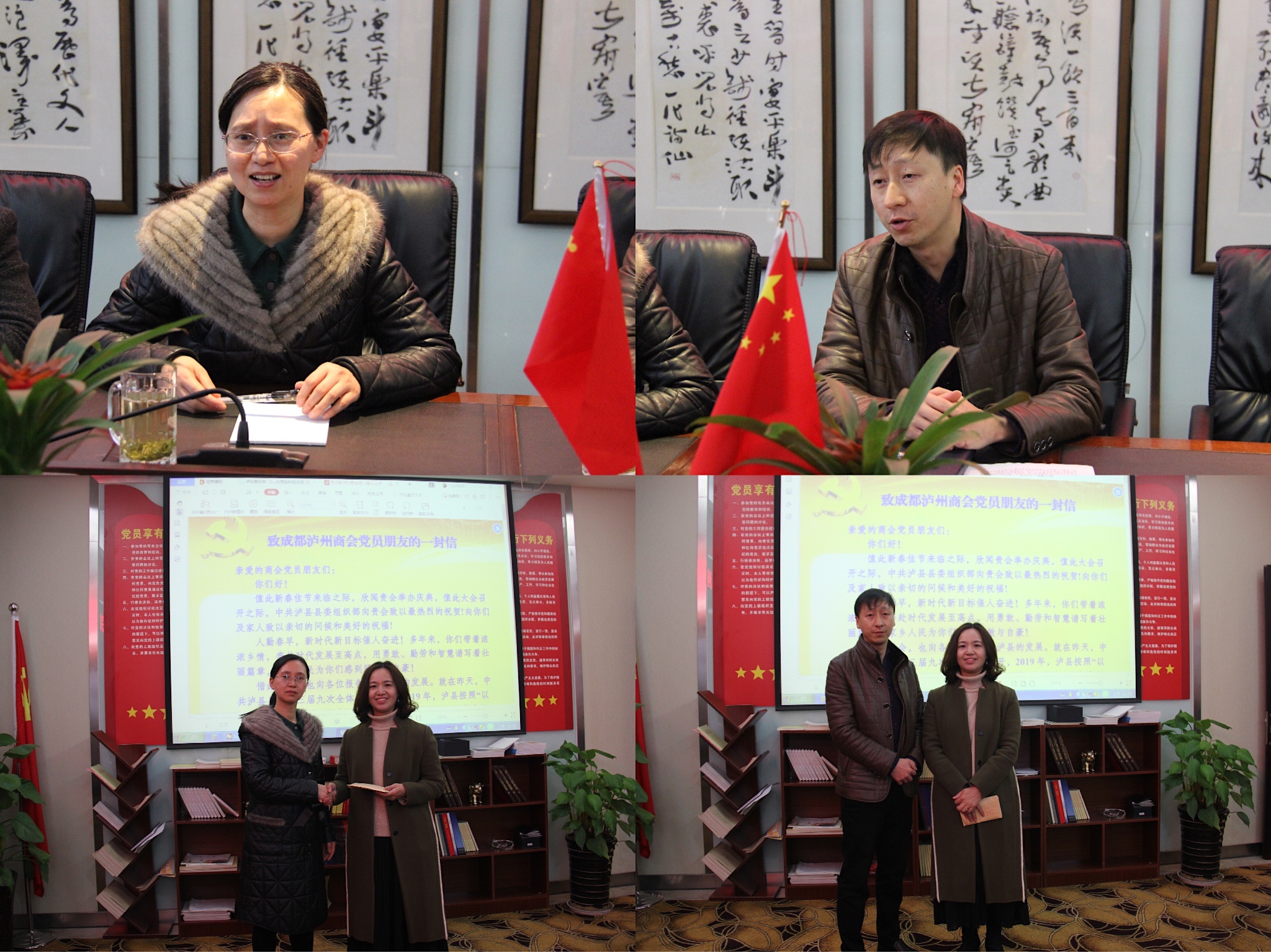 调研组一行还利用座谈会这种形式进行了一堂生动的“不忘初心、牢记使命”微党课宣讲;同时,宣读了泸县关于对四星级标准化党组织进行奖励的决定;送来了《致成都泸州商会党员朋友的一封信》进行关爱慰问;发放了“两新”党建工作经费补助,作为支部开展党建工作经费;赠送了《泸县“不忘初心、牢记使命”主题教育学习资料》。李庆副部长对商会泸县支部利用自身优势,积极开展党建工作,并取得一定成绩,给予了高度评价。在新的一年里,李庆副部长要求商会泸县党支部:发扬成绩,工作不断创新,要以“组织工作标准化建设年”为主题,积极推进“两学一做”学习教育常态化和开展“不忘初心、牢记使命”主题教育活动,充分发挥党组织的组织优势、组织功能、组织力量,把基层党支部建设好,同时,希望商会会员企业和党员同志积极参与家乡的社会和经济建设。